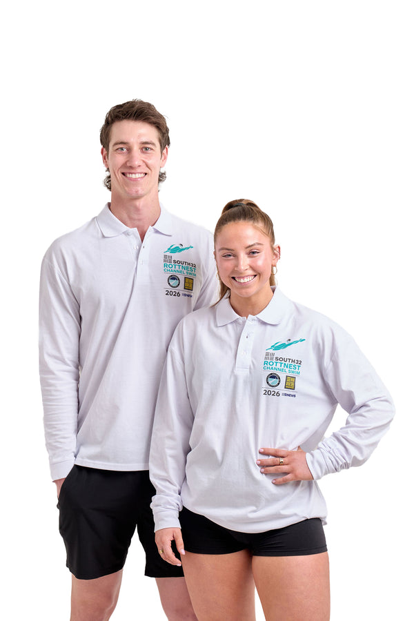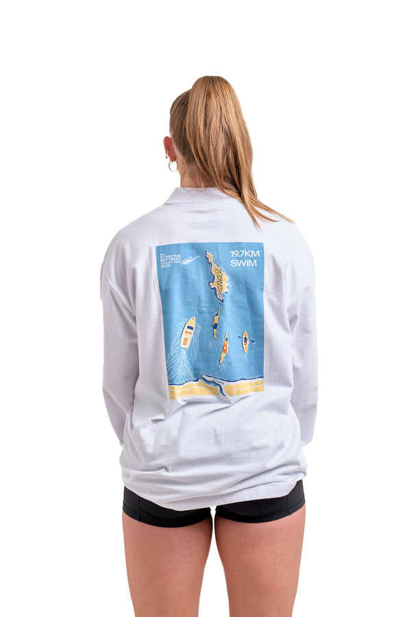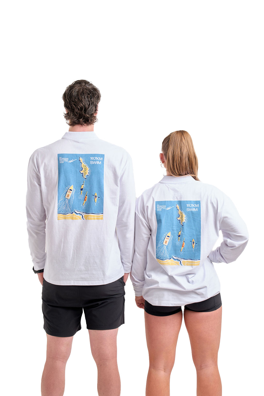 The iconic Long Sleeve Event Shirt features the official event logo and a limited-edition graphic print on the back of the shirt – which is unique to each year of the swim. The Event Shirt is made from a heavy weight, high quality fabric, which is made from a blend of recycled plastic waste & recycled cotton. The plastic waste is removed from ocean waste & landfill, and then cleaned, broken down and spun into polyester fibre. The recycled cotton is made from cotton scraps and offcuts that would ordinarily become landfill.